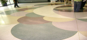 水磨石因其原材料來源豐富,價格較低,裝飾效果好,施工工藝簡單等優(yōu)點,獲得較為廣泛的應用。水磨石也是一種人造石,用水泥做膠結料,摻入不同色彩,不同粒徑的大理石或花崗石碎石。經(jīng)過攪拌、成型、養(yǎng)護、研磨等工序,制成一種具有一定裝飾效果的人造石材。
